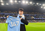 #赵心童获赠曼城球衣# 欧冠联赛阶段第5轮,曼城主场0-2不敌勒沃库森,遭遇本赛季欧冠首败,本场比赛世锦赛冠军@赵心童呀 来到伊蒂哈德球场现场观战,并获赠印有147的曼城球衣