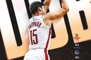 体育资讯11月27日讯 当地时间感恩节,火箭官方晒出了战胜勇士的赢球海报,封面人物是谢泼德,背景字样是“胜利(dub)”。