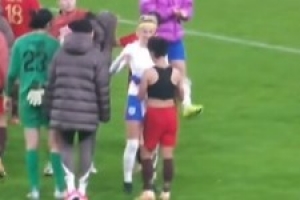 赛后,中国女足球员张琳艳和英格兰女足中场凯莉现场交换球衣。