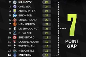 体育资讯12月02日讯 本赛季英超已经进行了13轮,赛季已过三分之一,积分榜上的竞争依旧非常激烈,第2名曼城与第14名埃弗顿之间的差距只有7分。