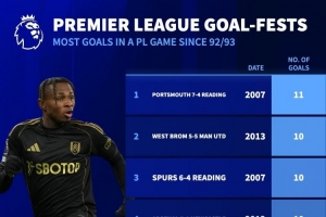 体育资讯12月3日讯 英超第14轮比赛,曼城客场5-4击败富勒姆。德国转会市场指出,英超历史上只有6场比赛的进球数量多于此役。