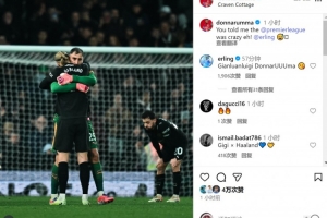曼城门将多纳鲁马社媒晒出与哈兰德拥抱的照片,配文:“你早就告诉过我英超很疯狂,是吧!😅”