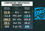 勇士场均净胜分高达+14.8分,雷霆达到了+15.5分