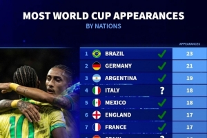 体育资讯11月18日讯 德国转会市场统计了各国参加世界杯决赛圈阶段比赛的次数,并列出榜单,巴西23次居首,德国、阿根廷二三位。