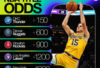 直播吧12月8日讯 博彩网站更新了本赛季夺冠赔率,雷霆、掘金、火箭、湖人前四,具体如下: