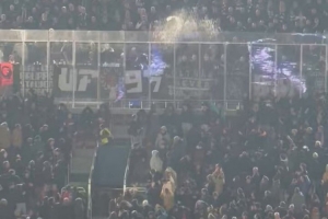 法兰克福球迷还两次向巴萨球迷所在的看台投掷烟火。