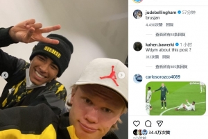 体育资讯12月13日讯 哈兰德更新社媒,晒出自己和贝林厄姆的合照。贝林厄姆则评论回复:老铁。
