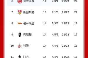 体育资讯12月15日讯 德甲第14轮基本结束,拜仁2-2美因茨9分领跑,此前第2的莱比锡本轮1-3不敌柏林联合,第3的多特1-1憾平弗赖堡,最新积分榜如下: