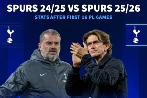 体育资讯12月16日讯 热刺在本赛季英超表现低迷,新帅弗兰克执教未能达到预期,《转会市场》统计显示热刺的表现还不及上赛季同期。