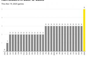 上图为雅虎记者制作的赛季至今联盟的背靠背数量统计,火箭0个,其他球队都是2个或者3个,勇士5个;