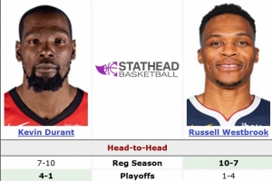 在本场比赛之前,杜兰特和威少常规赛相遇17场,杜兰特7胜10负;季后赛相遇5场,杜兰特4胜1负。