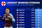 本世纪英超俱乐部各项赛事连胜纪录: