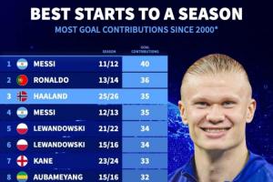 体育资讯11月20日讯 德转统计了本世纪赛季开局的进球贡献数,哈兰德以35粒进球位居历史第三,仅次于梅西和C罗。