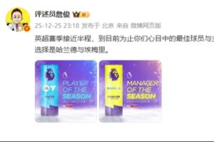 詹俊:英超赛季接近半程,到目前为止你们心目中的最佳球员与主教练是哪位?我的选择是哈兰德与埃梅里。