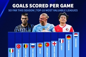 体育资讯11月20日讯 德国转会市场统计了欧洲总身价前10联赛的场均进球数量,并列出榜单,荷甲3.36球居首,德甲、法甲二三位、意甲2.22球垫底。