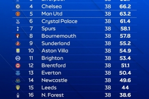 体育资讯11月20日讯 天空体育预测了本赛季英超联赛的最终排名,阿森纳夺冠。