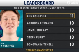 体育资讯12月27日讯 克尼佩尔本赛季已经有过11场比赛单场至少命中5记三分,这一数据领跑全联盟。