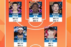 2025-2026赛季CBA联赛常规赛第7轮结束较量,来自北京控股篮球俱乐部的朱松玮和佩里,南京同曦篮球俱乐的郭昊文,宁波富邦町渥男篮的辛普森和浙江稠州篮球俱乐部的吴前入选CBA联赛常规赛第7轮最佳阵容!