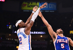 76人这边,恩比德没有出战,马克西发挥出色,出战36分钟,投篮18中10,三分7中2,罚球7中6,砍下全队最高28分,外加2篮板5助攻4抢断,也出现4失误,正负值-22。马克西上半场10投8中就已经砍下23分,但下半场8投仅2中只得到5分。