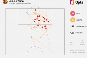 Opta指出,五大联赛球员之中,仅亚马尔、奥利塞2025年各赛事进球20+且助攻20+,其中亚马尔21球20助,奥利塞21球24助。