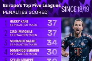 18-19赛季以来五大联赛点球进球排名: