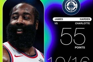 全场比赛,快船球星哈登出战35分钟,26中17,三分16中10得到55分3板7助攻1抢断。